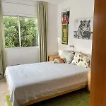 The kitchen amenities at the Sitges accommodation feature tea and coffee making equipment, a fridge, and kitchenware, provided in an outdoor dining area. The nearest bus stop, Cementiri, is only 500 metres away.